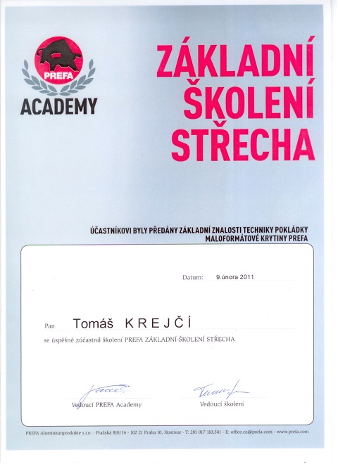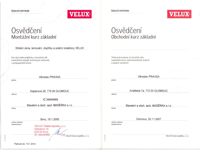 Prohlédněte si certifikáty a osvědčení pro montáže střešních krytin a oken. Nabízíme kvalitní klempířské a pokrývačské práce šikmých a plochých střech. Používáme stavební materiály předních dodavatelů. Zavolejte naši stavební firmu!
